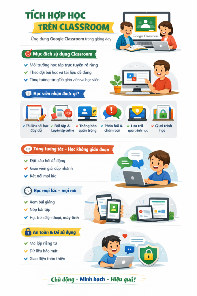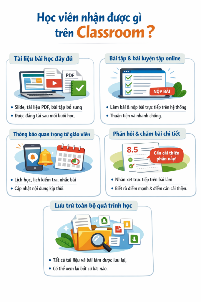 Để nâng cao hiệu quả học tập và giúp học viên quản lý việc học thuận tiện hơn, trung tâm áp dụng hệ thống Google Classroom trong toàn bộ quá trình giảng dạy.