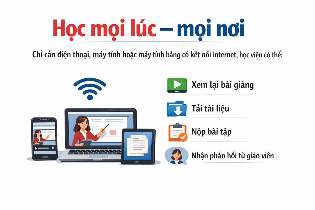 Chỉ cần điện thoại, máy tính hoặc máy tính bảng có kết nối internet, học viên có thể: