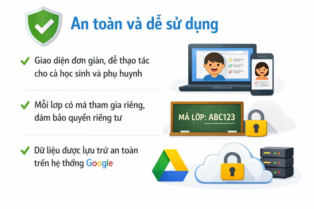 • Mỗi lớp có mã tham gia riêng, đảm bảo quyền riêng tư